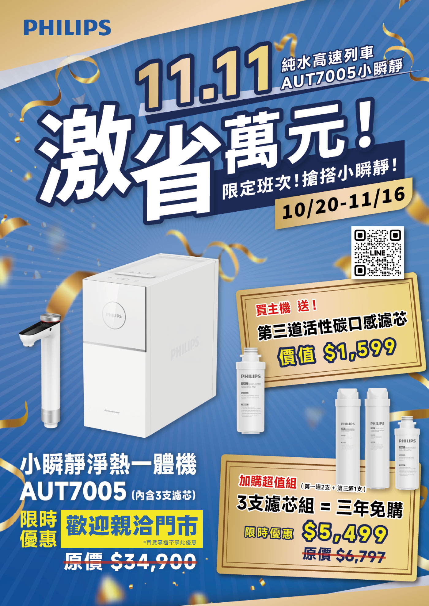 10/20~11/16 飛利浦AUT7005小瞬靜激省萬元! 限時優惠歡迎親洽 富山淨水有限公司