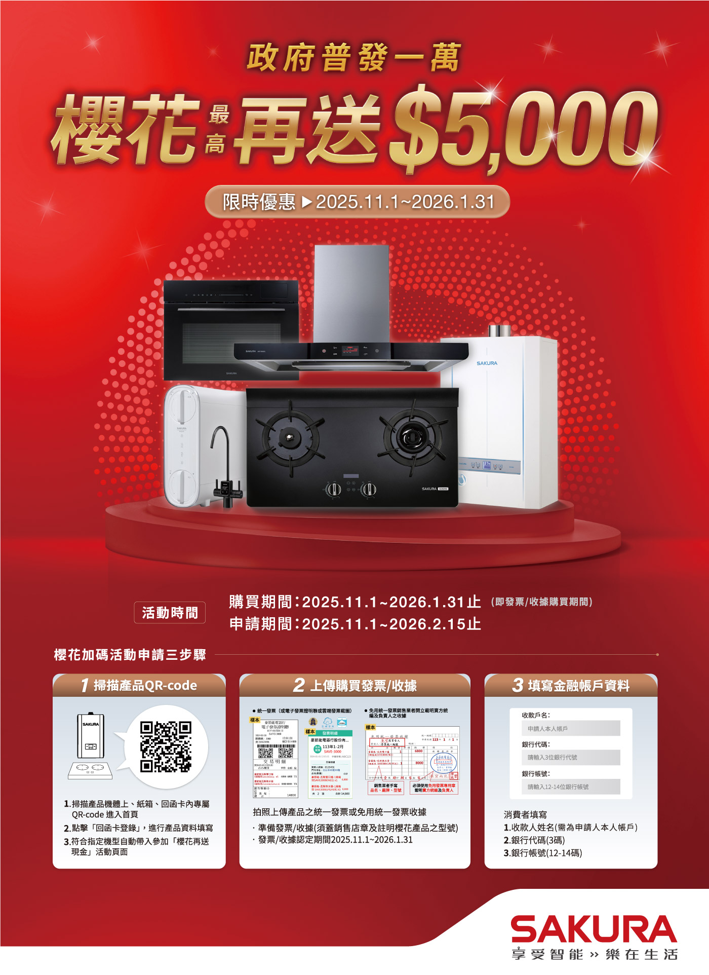 即日起至2026/01/31,櫻花指定產品回饋最高$5,000