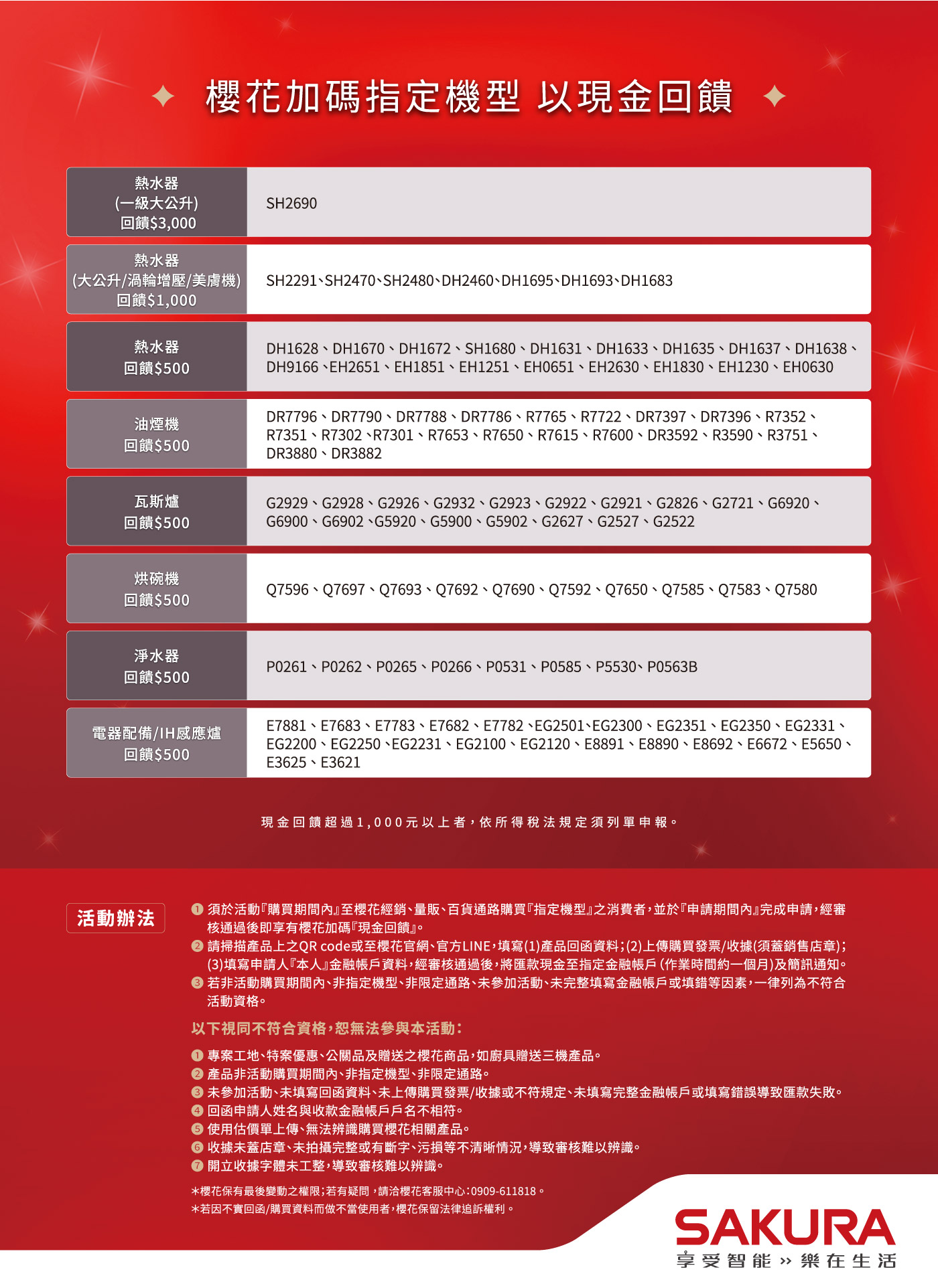 (詳細活動辦法及回饋指定商品詳見下圖公告, 活動如有變動請依照櫻花官方公告為主)