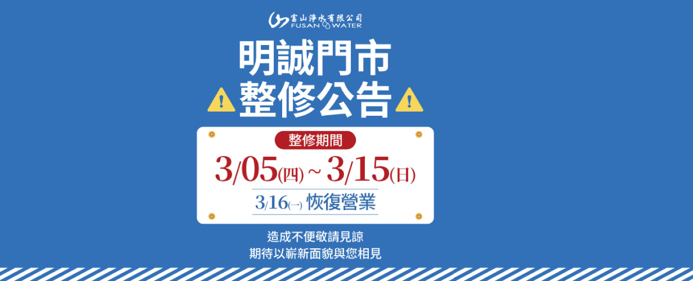2026 【高雄明誠門市】整修通知: 親愛的富山淨水有限公司客戶您好,高雄左營區的明誠門市將於 3/5(四) ~ 3/15(日) 進行門市整修 如有購買淨水器及濾心耗材...等需求,歡迎至就近的高雄地區門市試喝體驗及洽詢,造成不便敬請見諒。 感謝舊雨新知多年的支持與愛護,【高雄明誠門市】將以全新樣貌於3/16 (一)恢復營業,持續為您提供更優質的服務品質~*