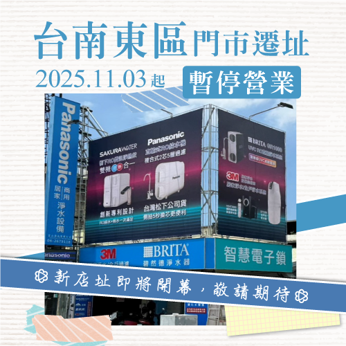 為了提供更好的服務品質,三心科技 x 富山淨水有限公司 【台南東區門市】全店將遷址並重新裝潢 原門市地址:台南市東區中華東路三...