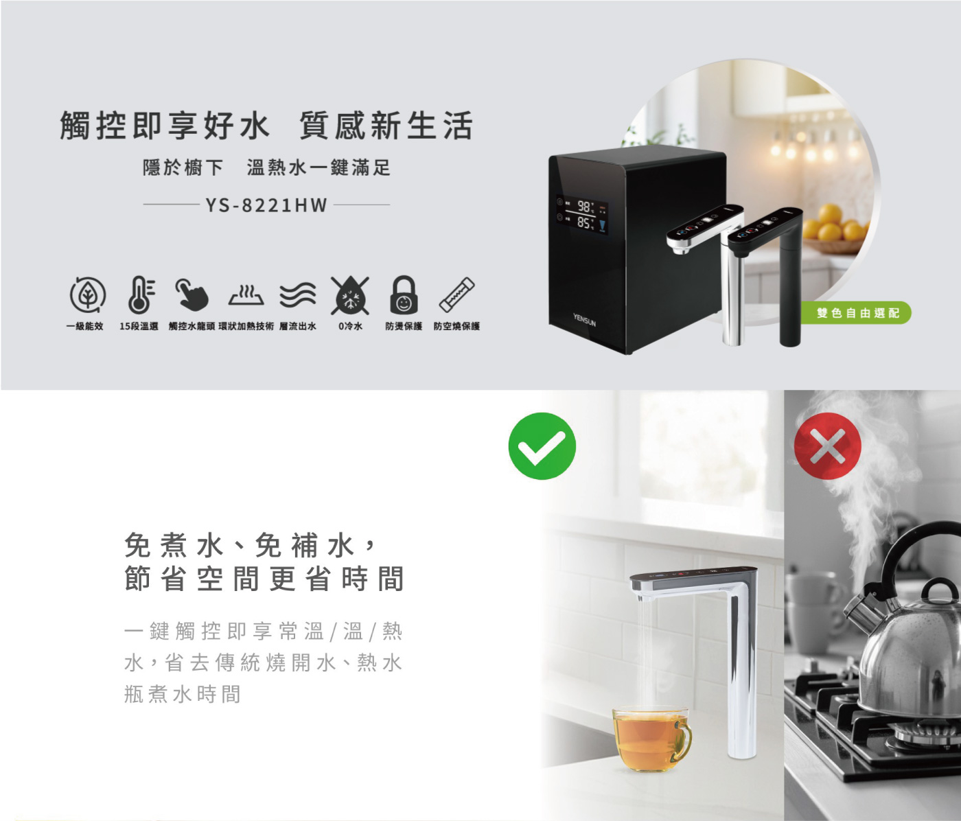 元山 淨水雙溫組-元山櫥下型觸控飲水機搭配水空間櫥下直出RO淨水器(WS-MinO-R2+YS-8221HW)