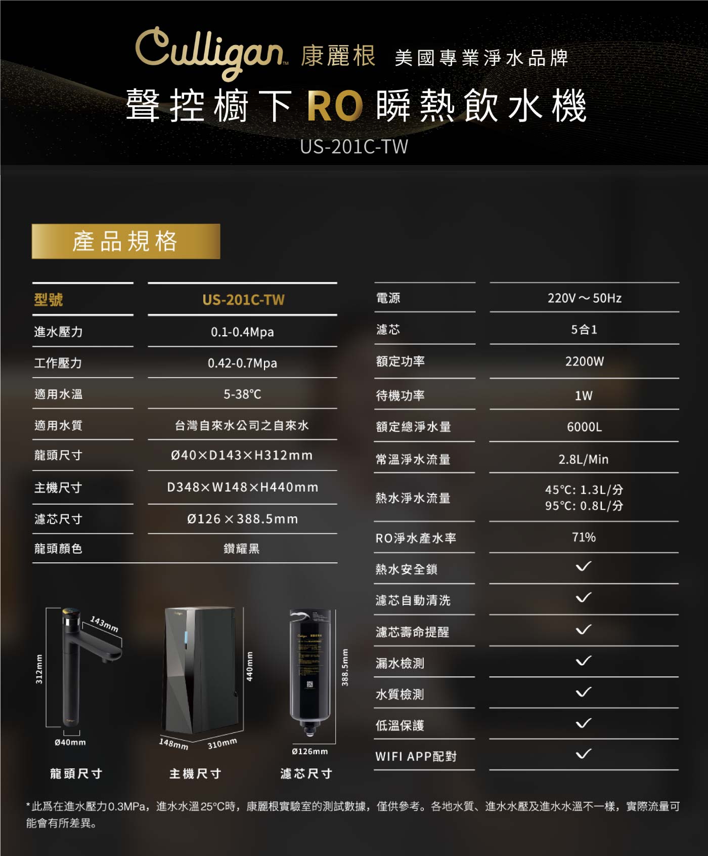 ▸RO濾芯+主機2合一 ▸WIFI聯網 使用狀態一手掌握 ▸2.8L/分大流量常溫水 ▸瞬熱直上45℃、95℃雙溫,最高可省電達97% ▸五合一單管RO濾芯,2年只需要更換1支濾芯 ▸通過SGS國家飲用水標準的純淨RO水 ▸商檢字號:T3B894 *新科技聲控龍頭,可透過聲控控制開關水、水量與水溫 *此機型適用電壓為220V