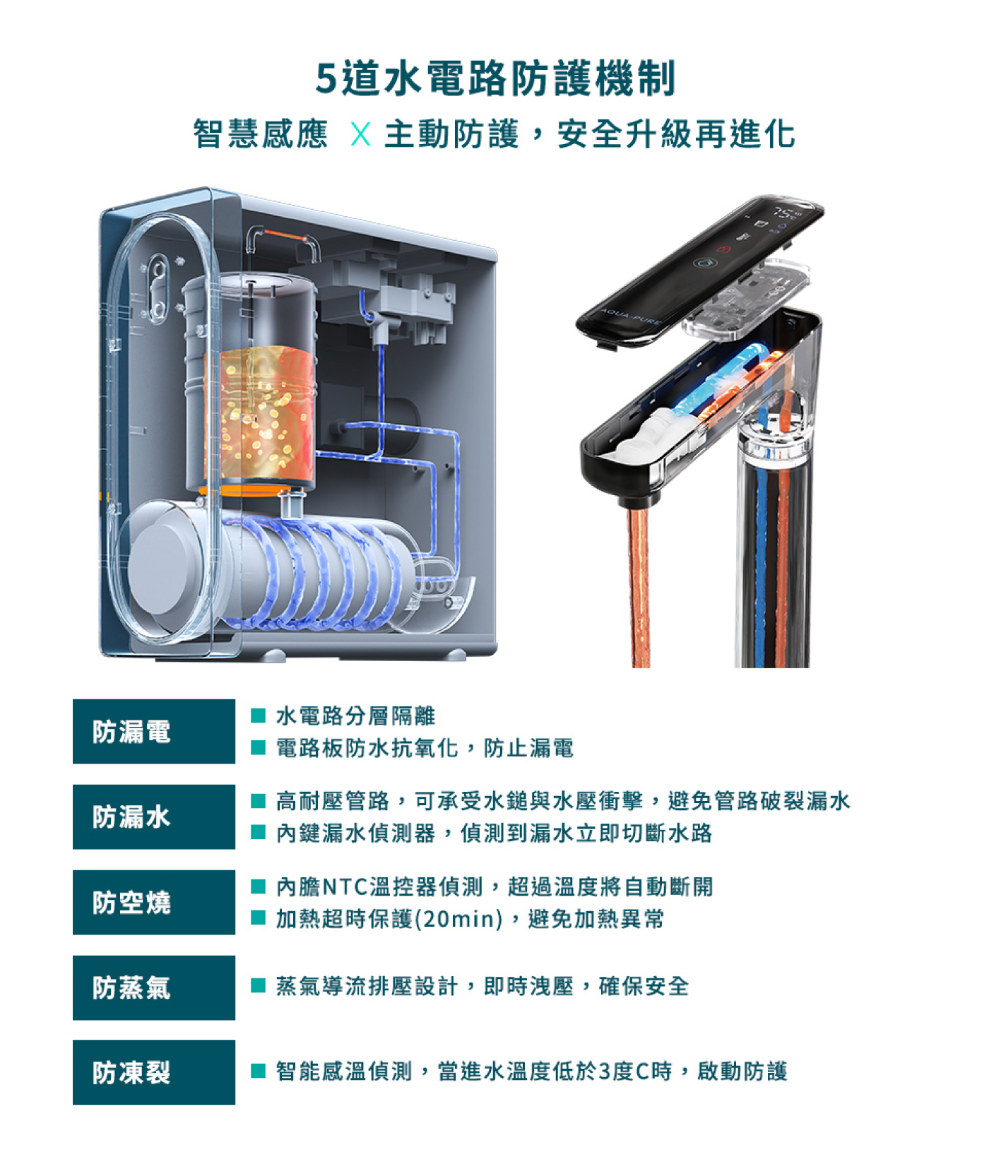 ▸五道安全防護機制,防漏電、防漏水、防空燒、防蒸氣、防凍裂